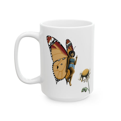 "Beautiful Menace" Butterfly & Daisy Ceramic Mug — Monarch Butterfly Floral Coffee Cup (11oz/15oz)